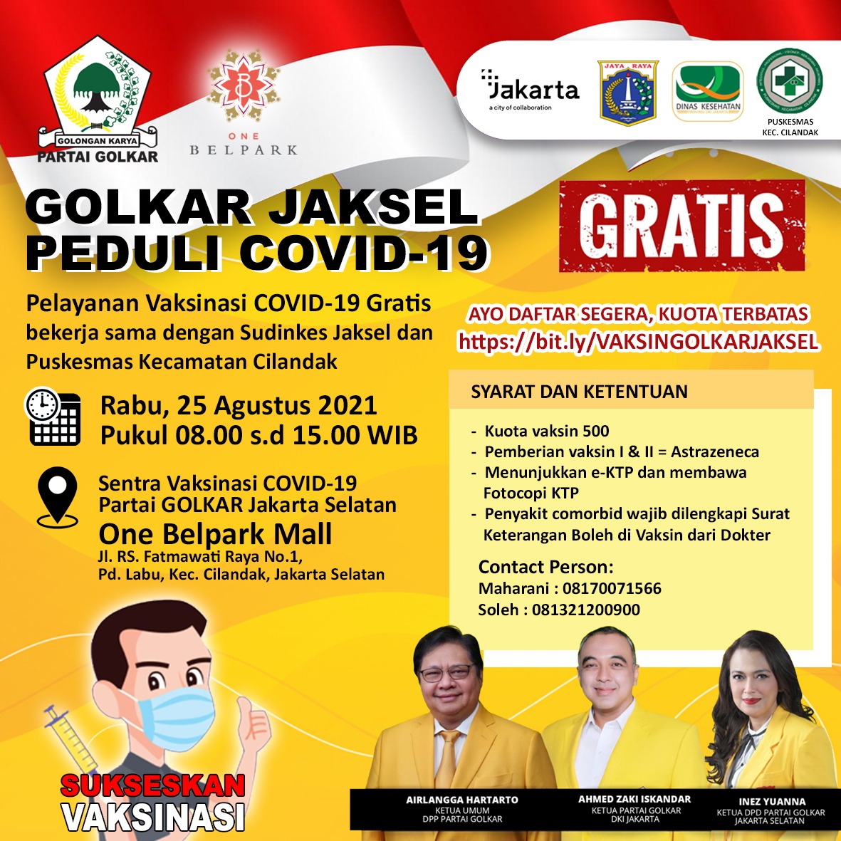 “Kegiatan ini sebagai upaya mendukung dalam program vaksinasi dan perhatian DPD Golkar bagi masyarakat agar dalam kondisi sehat untuk meningkatkan imun dalam menghadapi pandemi Covid-19,” Terangnya.