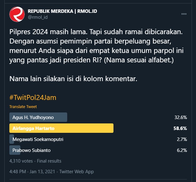 Polling online ini dilaksanakan selama 24 jam dengan menggunakan hestek #TwitPol24Jam, berakhir pada Kamis (14/1/2021). Polling mendapatkan respons dari 4310 pemilih, dan menempatkan Ketua Umum Partai Golkar Airlangga Hartarto di urutan satu, dengan persentase 58,6%.