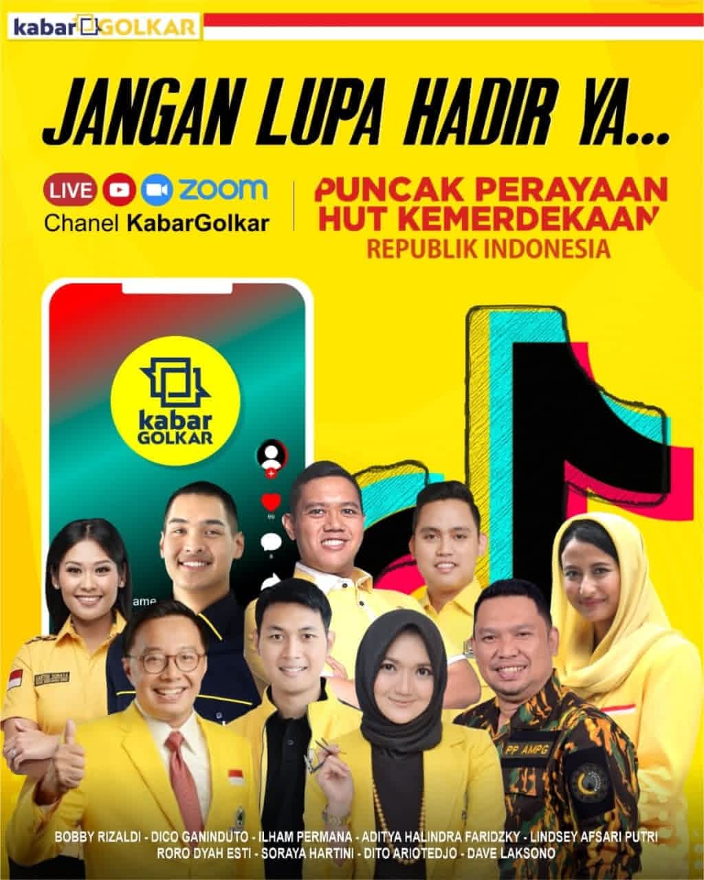 Acara Puncak perayaan HUT kemedekaan RI ini akan dimulai pada pukul 13.00 WIB dan dapat diikuti secara live melalui channel Youtube Kabar Golkar dan Instagram maupun zoom.