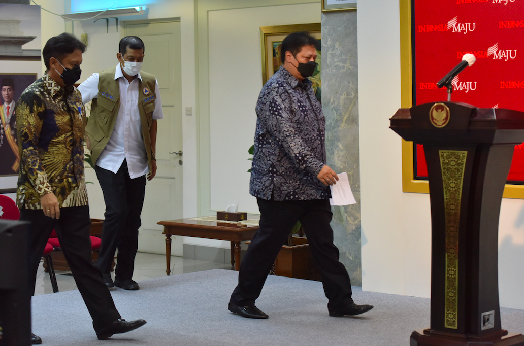 PPKM level 3, lanjut Menko Airlangga, diterapkan 38 kab/kota. Kemudian PPKM level dua berlaku di 278 kab/kota dan level satu diterapkan di 69 kab/kota.
