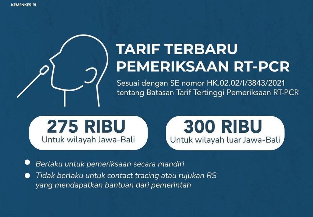 Seperti diketahui, harga tes PCR di Indonesia cukup bervariatif. Berkisar antara Rp 700.000 hingga Rp 1.000.000. Sementara Kemenkes mematok maksimal Rp 900 ribu. Hal ini tertuang dalam Surat Edaran Nomor HK.02.02/1/3713/2020 tentang batasan tertinggi untuk pemeriksaan RT-PCR dan swab.